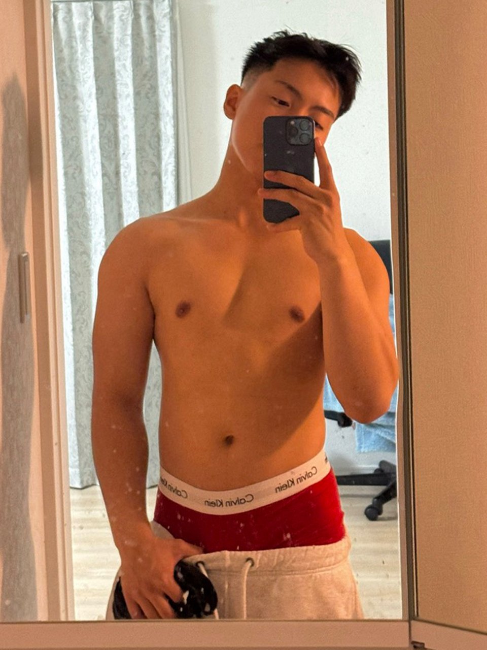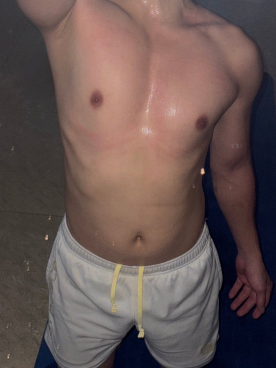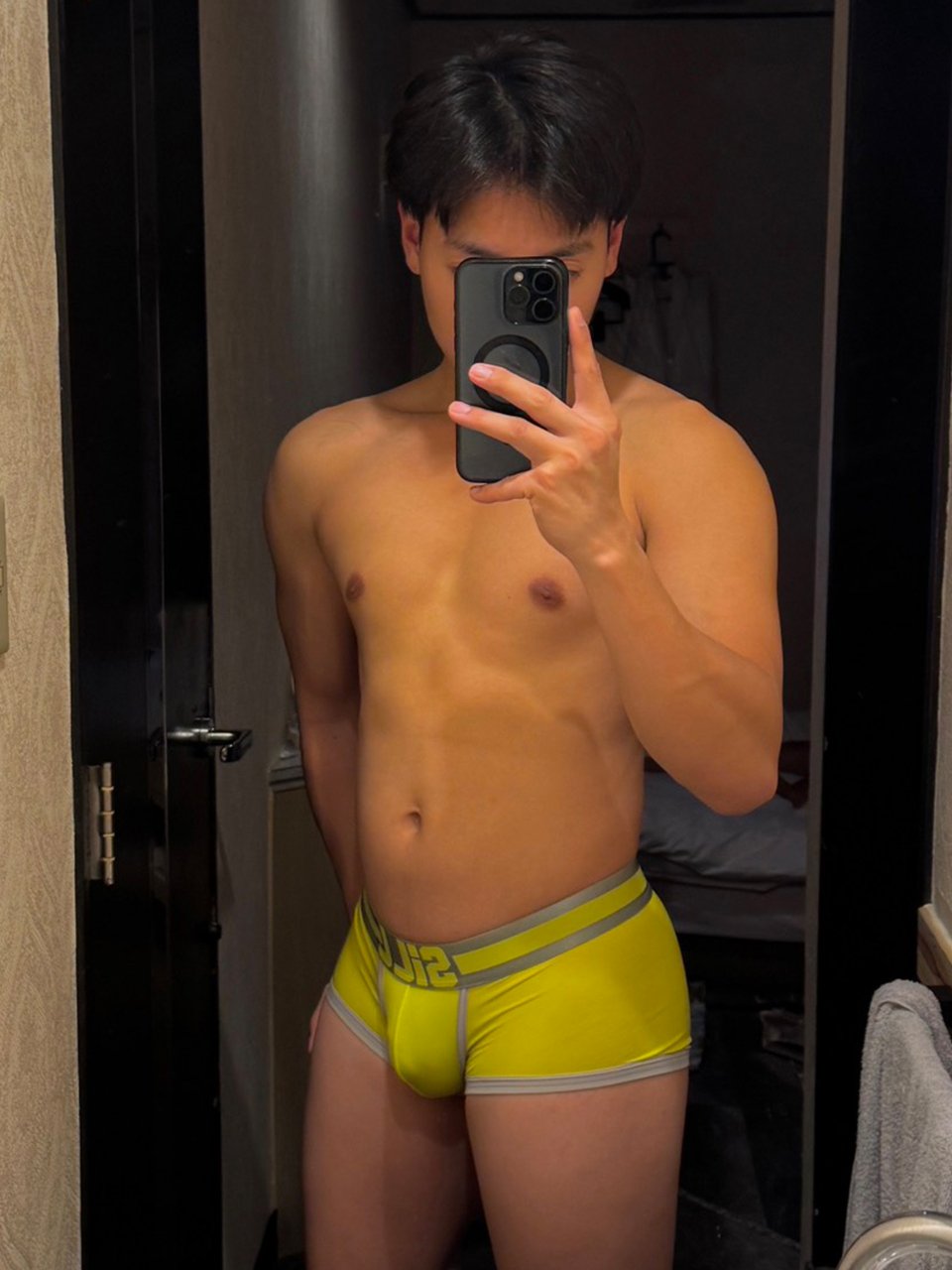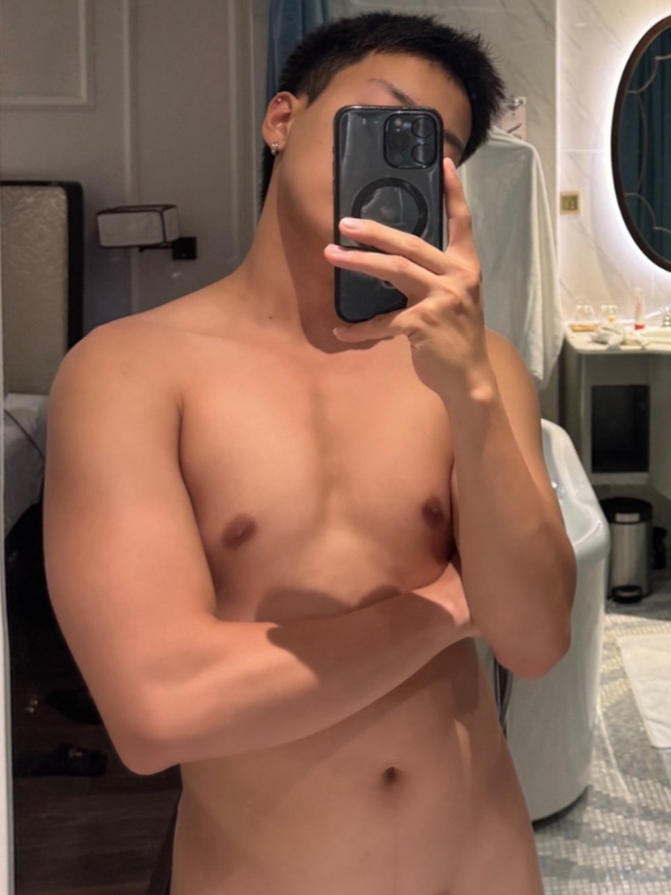 筋肉質のがっちりしたいい体で胸筋がきれいです。シャワーに行く前に触っていると、巨根はガチガチになりました。太くて硬さもすごかったです。最後はすごい噴射、量も勢いもすごくて、全部出たかと思って油断したら、まだ残っていて顔に大量にかけられました。最後の一滴まで美味しくいただきました。少年の雰囲気が残ったかわいい少年系の笑顔がとても可愛かったです。今日もいい新人に会えました。